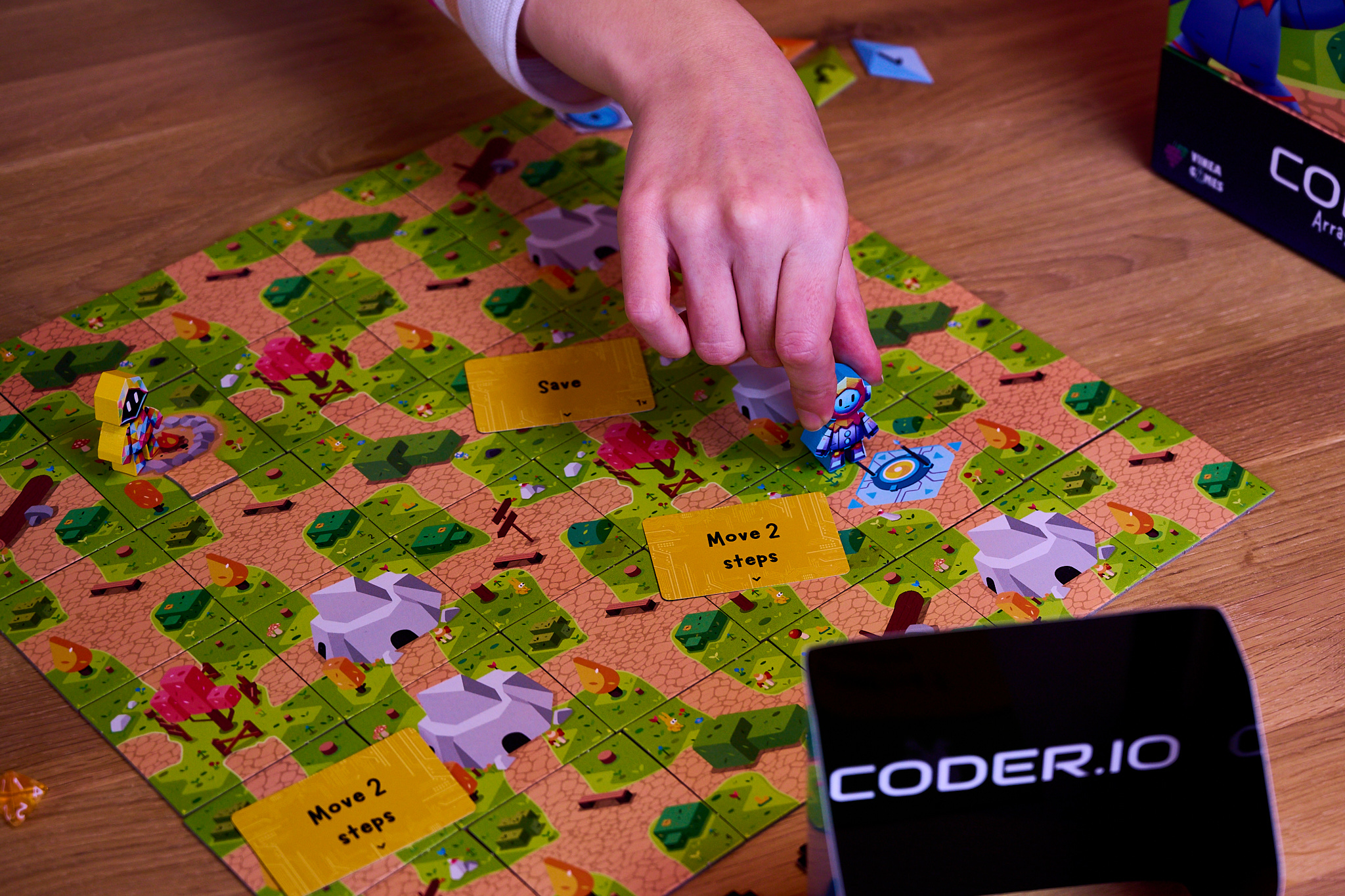 Nutze deine Startcodekarten, um deinen Roboter über die Karte zu bewegen. Versuche, das Ziel zu erreichen oder sammle zusätzliche Codekarten.